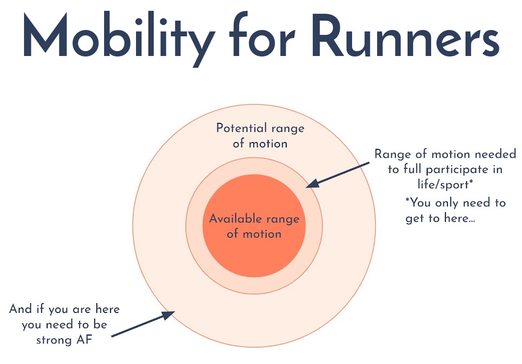 Hey Reader, In this email, I’m circling back to a topic I touched on briefly last week: the relationship between mobility, stiffness, and stability. Many runners assume that more mobility is always better, but that isn’t necessarily true. In fact, some of the bendiest runners I meet are often the stiffest in very specific areas such as the feet, calves, pelvic floor, or neck. If you can straight leg palm the floor with ease, I’m looking at you! Why Your Body Craves Stiffness and StabilityThe body doesn’t just need mobility, it needs strength through your range of motion and typically needs stiffness and stability elsewhere to feel safe enough to perform that range of motion. Runners with hypermobility or naturally looser connective tissue often grip or hold tension in other areas to create this sense of safety. This is why a constant feeling of tightness doesn’t always resolve with stretching. True relief often comes from generating the right kind of stiffness and stability so that the body can finally let go where it has been holding unnecessary, chronic tension. One example is the overcoming hinge isometric. This exercise requires full-body tension in a hinge position, which paradoxically allows the glutes and posterior pelvic floor to release. In other words, creating tension (safety) in the right place allows the body to let go somewhere else where it’s likely been gripping to create the feeling of safety. And by the way, gripping in the glutes and posterior pelvic floor is such a widely common problem that I made this sign… Rethinking Mobility: The Three CirclesIt’s helpful to think of mobility as three concentric circles: